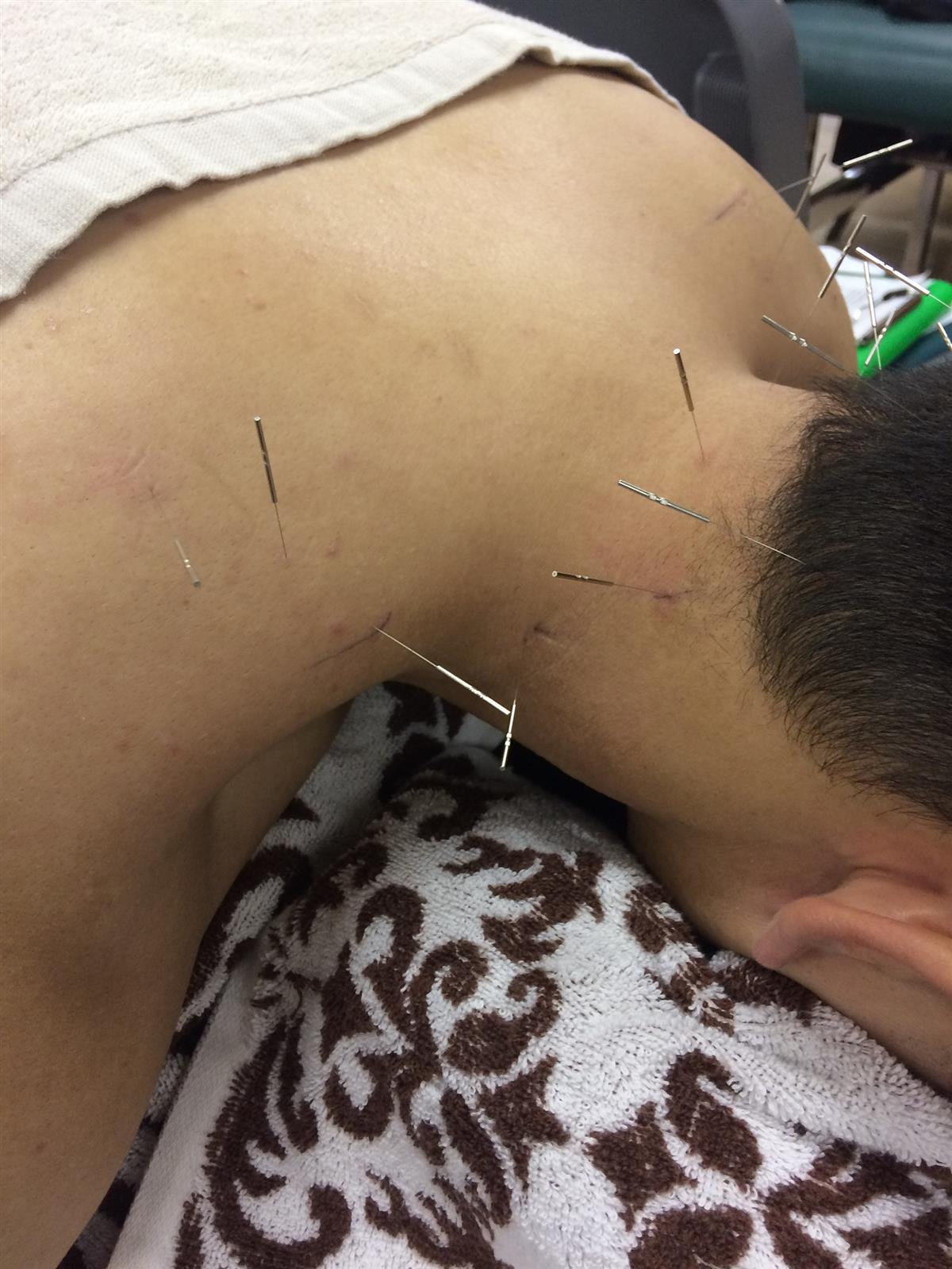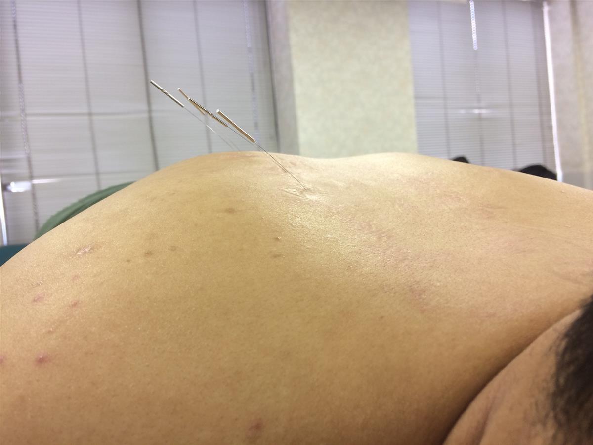 - 背部多裂筋刺鍼。きわどい治療箇所もより安全・より正確に刺鍼できるよう日々鍛錬を怠りません。